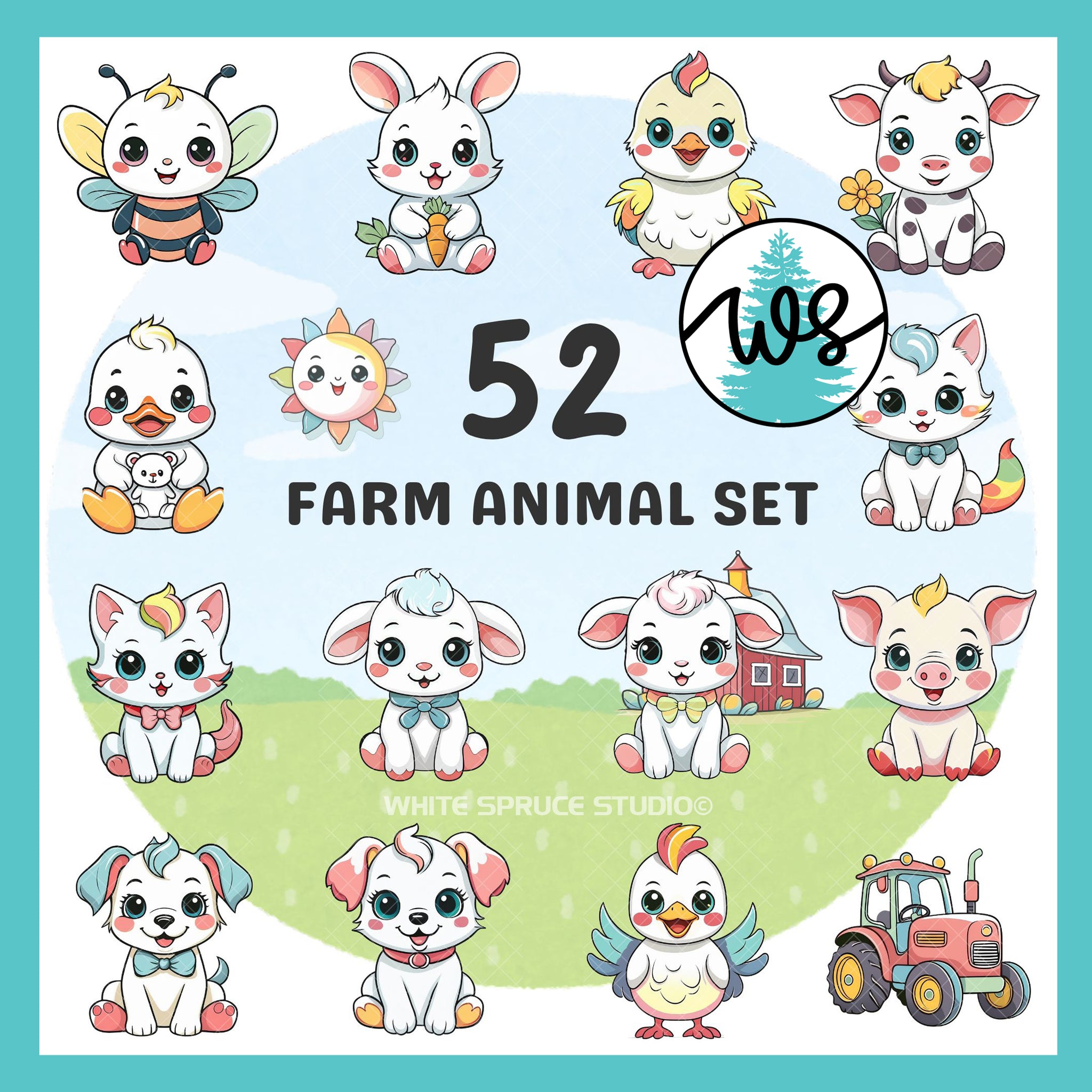 ♦︎ This adorable clipart bundle includes 52 sweet baby farm animal elements illustrated in a soft, playful style, perfect for nursery art, children’s designs, party decor, invitations, shirts, cards, and playful creative projects.