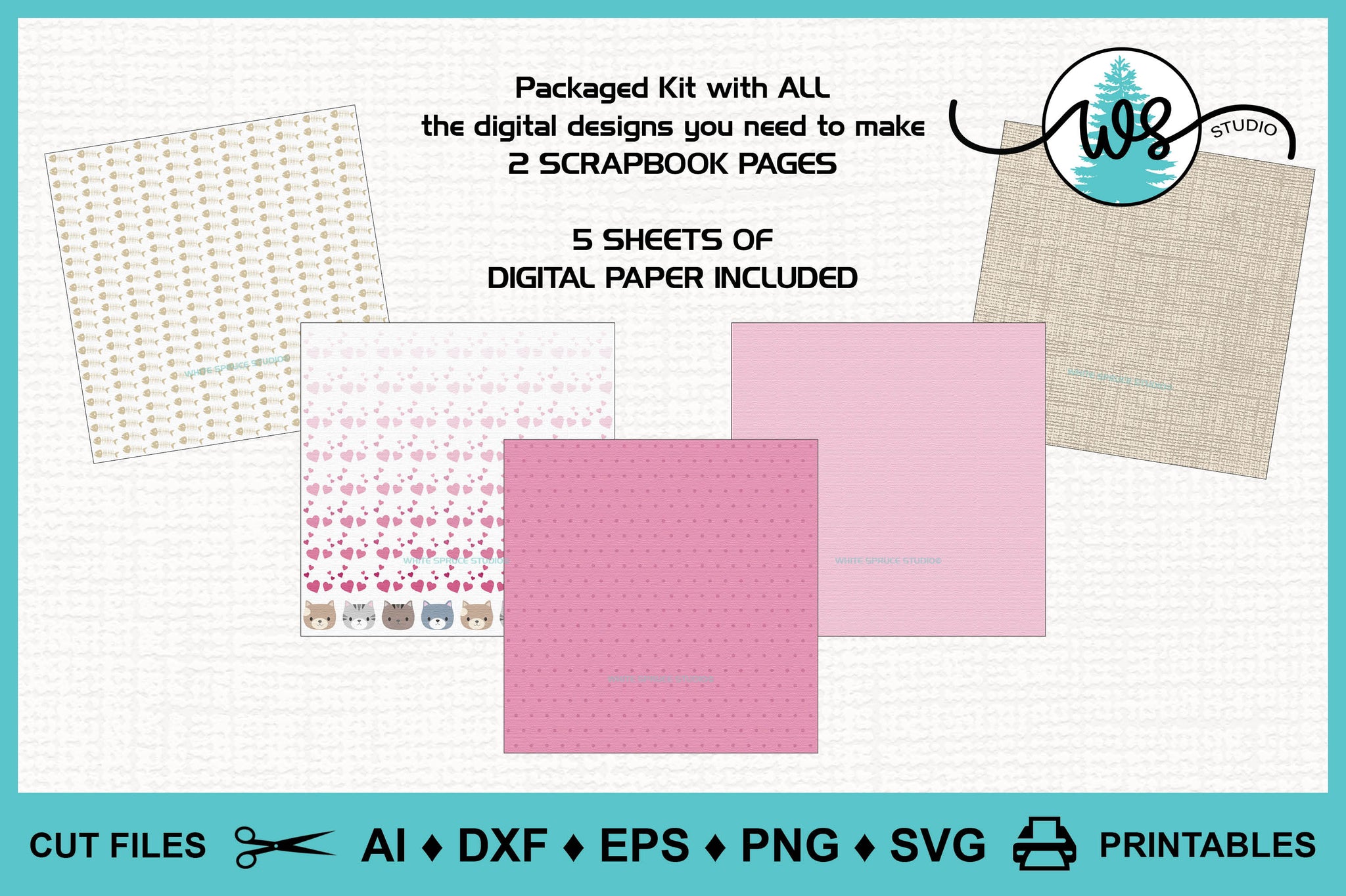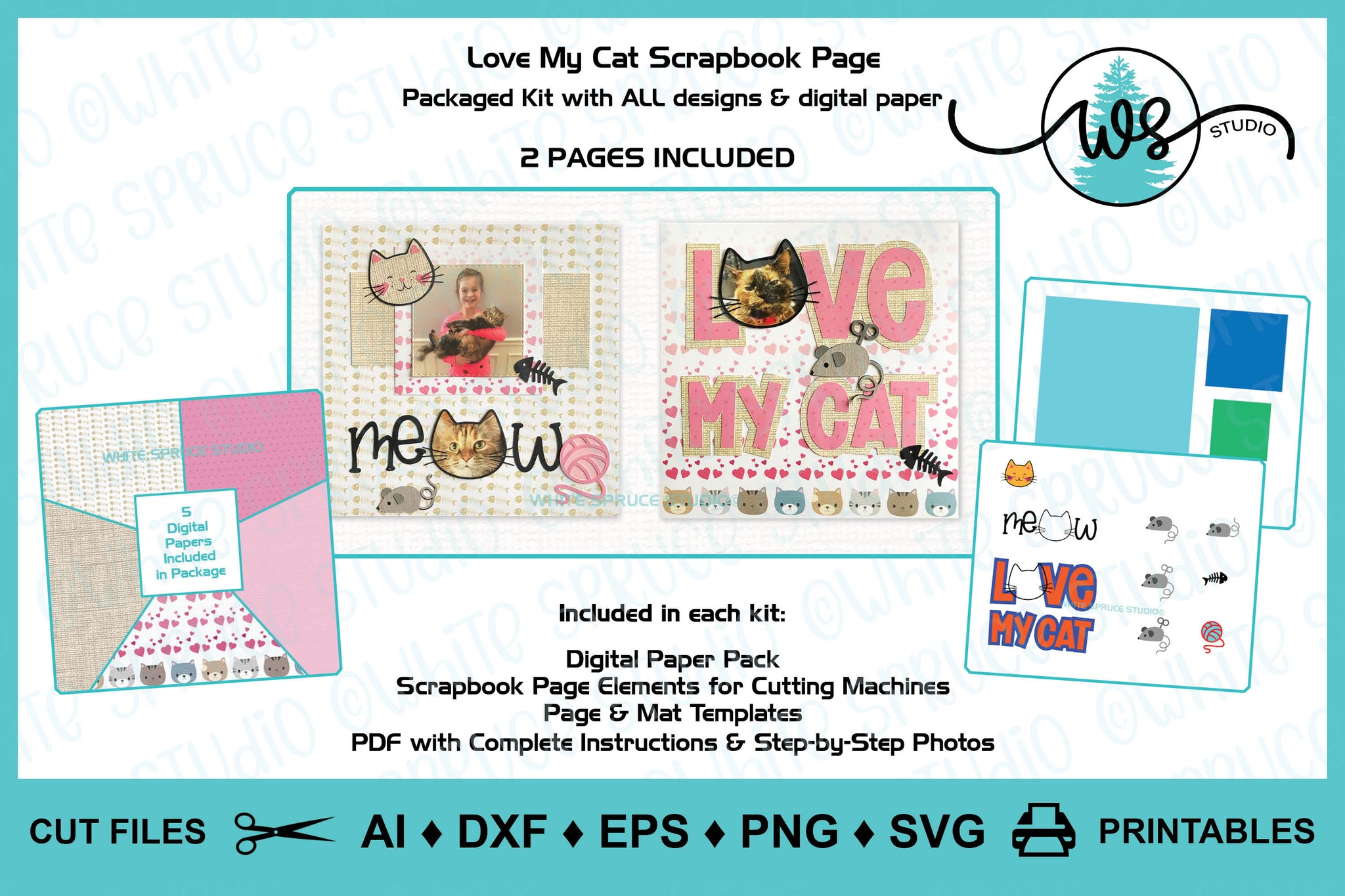❤️ This is a PACKAGED KIT with ALL DIGITAL PRODUCTS. The scrapbook page elements are digital craft patterns designed by White Spruce Studio especially for cutting machines. Also included in this PACKAGED KIT are digital papers as shown in the photos and complete instructions with step-by-step color photos.