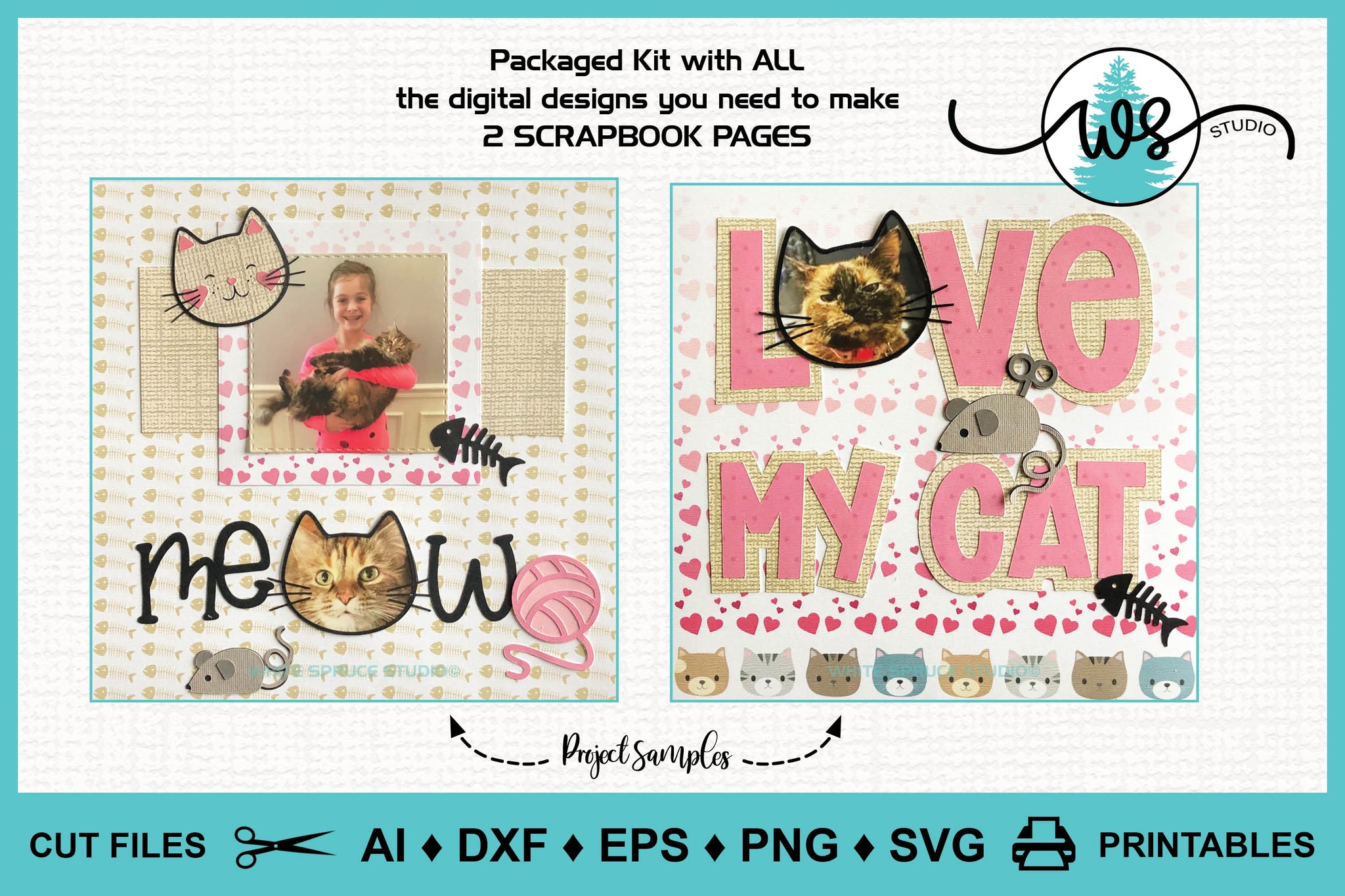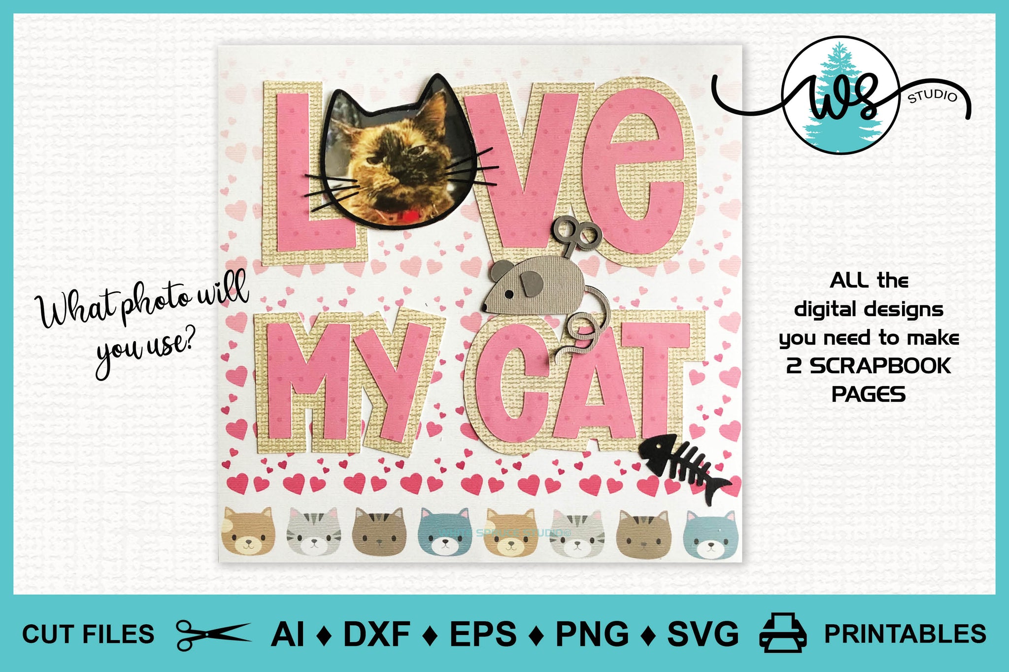 ❤️ Scrapbook page SVG with 2 scrapbook page designs featuring a cat and cat head photo frames, Love My Cat text, Meow text, cat toys; perfect to keep or give for the cat lover.