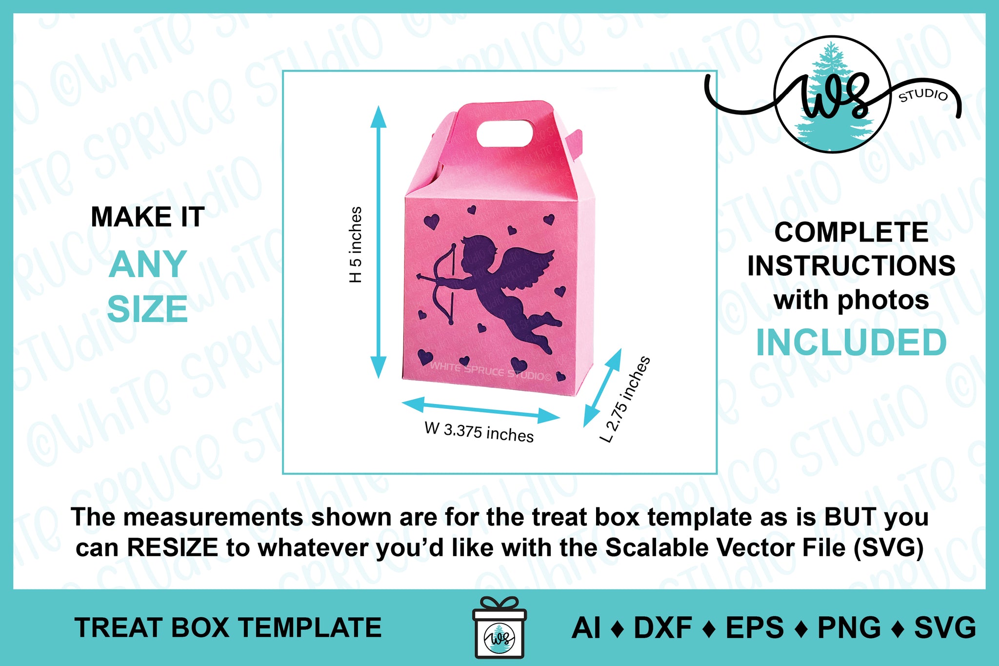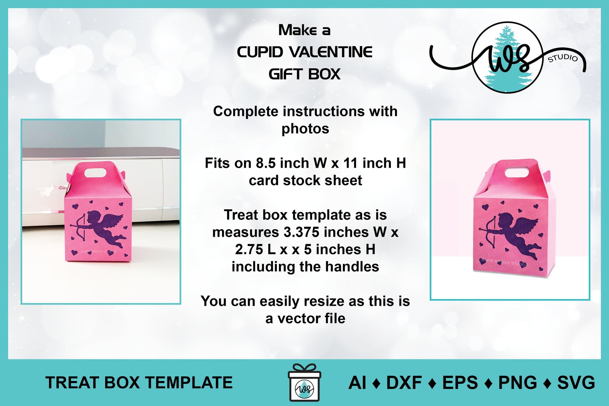 ♦︎ This treat box template is a digital craft pattern designed by White Spruce Studio especially for cutting machines. Also included are complete instructions with step-by-step color photos.