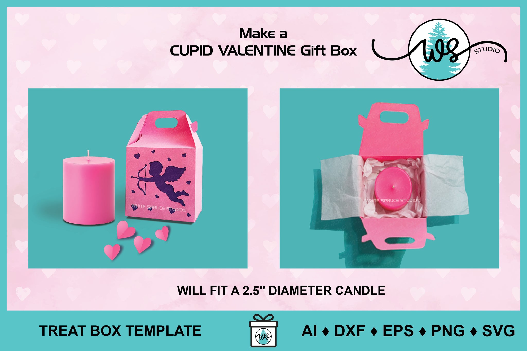♦︎ Create a charming Valentine’s Day surprise with this 3D Cupid Gift Box SVG—an easy Valentine treat box and paper gift box template perfect for DIY Valentine crafts, featuring a Valentine cut file for making your own SVG Valentine box or Cupid gift box, large enough to fit a 2.5 inch diameter candle.
